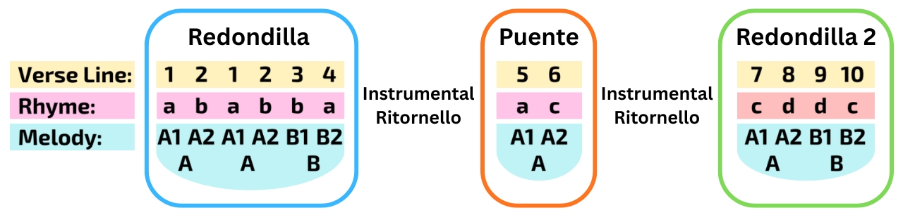 Decima espinela uses a rather interesting system comprised of ten-lines which follow an ABBA AC CDDC form, where each line is made up of eight syllables and lines with the same letter allocation must rhyme. While the system can be explained in a single sentence, it might be best if we unpack it a bit further because there is a level of complexity to decima espinela that is worth exploring. The first aspect is that a single decima includes ten lines, creating a unique form that contrasts heavily to the common rhyme schemes found in Western vocal music today (such as AABB or ABAB etc). Within those ten-lines, the vocalists must adhere to a strict eight syllable phrase per line, no more, no less. This approach is more comparable to poetry as it is rare for Western songs to have syllabic restrictions today, however my knowledge on historic European rhyme schemes is almost non-existent so I am unsure exactly how this would have compared to the common music of the 18th century. Finally, within the ten lines, there must be four different rhyming words used in a certain structure, best depicted by assigning letters to each line. For example, each A line must rhyme with each other, each B line must rhyme with each other, and so on. The first four lines, the ABBA section, is called the redondilla and constitutes a complete statement which is elaborated on in the following six lines. It is followed by an instrumental interlude called the ritornello which is then proceeded by lines 5 and 6, the AC section, which is called the puente as it is transitional in nature. Finally, the last four lines, the CDDC section, make up a secondary redondilla which concludes the decima and is followed by another ritornello.