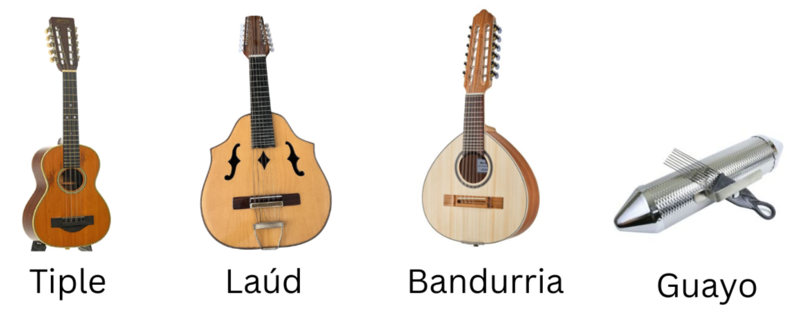 Switching gears to the ensemble, punto guajiro bands often feature a small number of instruments which call back to the earlier styles of music found on the island. Within the ensemble there are usually a variety of Cuban guitars used, including the Spanish guitar alongside either a laúd, tiple, or bandurria. The guitar often provides the harmonic framework for a piece through strumming progressions built around the I, IV, and V chords, while the bandurria (or one of the other Cuban guitars) is free to play more melodically. This is especially the case in the instrumental ritornellos where the bandurria plays single note improvisations and is the main focus of the music while the vocalists rest. There are also percussion instruments such as the claves, guiro, and guayo (a metal scraper), which support the whole ensemble and emphasize the dual sense of 6/8 and 3/4 by playing a sesquialtera throughout.