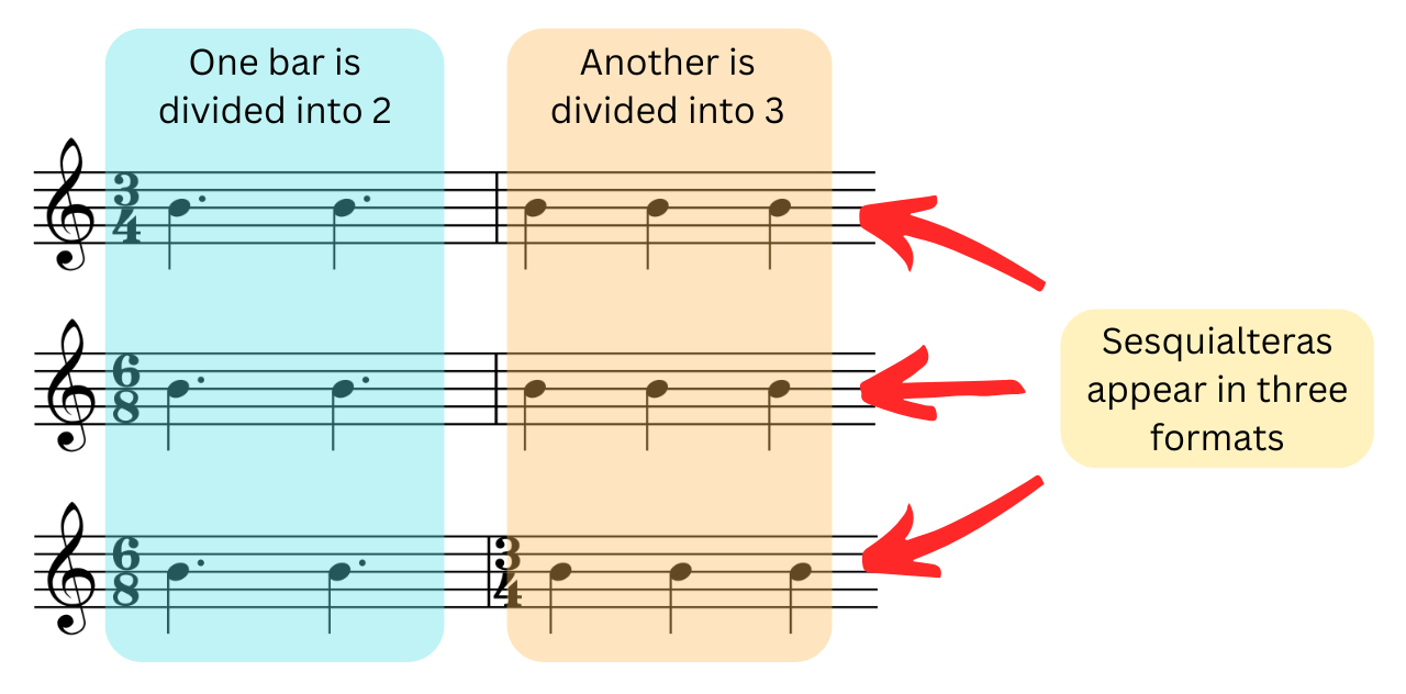 In punto guajiro we also find a unique rhythm, not exclusive to the style as we will see later, but prominent nonetheless. Often referred to as a sesquialtera, an older term that was used to describe a specific form of hemiola, the rhythm emerged in European music somewhere in the 15th or 16th centuries. Whether it was a result of the transatlantic slave trade and the influences of African culture on European society or was purely a European idea, we may never know, however it did become a staple part of early Cuban music. In order to understand the basic concept of a sesquialtera we need to remember that most of the Western music being played in the early centuries of Cuba’s history was in a triple meter (either thought of as 6/8 or 3/4). With this in mind, a sesquialtera is just a fun way of saying a 2-3 ratio over two bars, where the first measure implies a two feel while the second implies three beats. What this looks like in reality is a measure of 6/8 followed by a measure of 3/4, where the emphasis is on beats 1 and 4 in the first bar, and on beats 1, 2, and 3 in the second. Although it sounds somewhat complex when explained via text, when you see the rhythm written with sheet music or when heard, it is far easier to understand. For example, Leonard Bernstein makes use of a sesquialtera throughout the melody of America from West Side Story.