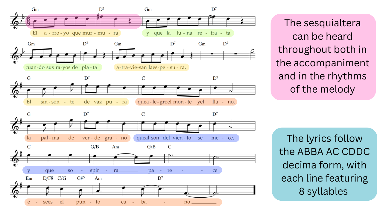 Whether it be the highly complicated decima form, the mixture of Cuban guitars, or a unique type of hemiola, punto guajiro really has a bit of everything. It is a style which doesn’t receive the same amount of attention as other Cuban music, but still has all of the charm and complexity of styles like son. Personally, I was shocked to come across it in the first place, however I am so glad I did because there are so many aspects to the style which resonate with me. But punto guajiro is not the end of our journey, and we now shift to a different area of Cuban vocal music, the theatre, where more styles await us.