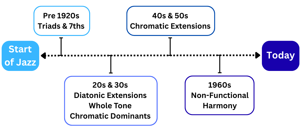 Interestingly, after the 60s, jazz harmony didn't progress to that many more unconventional locations, with only one or two sounds emerging. All of the specific techniques followed in line with the explorations of what had been previously established with the main shift taking place in other areas. To help summarize the progress of each period in jazz history I’ve created a graphic below which should hopefully help differentiate the various harmonic approaches.
