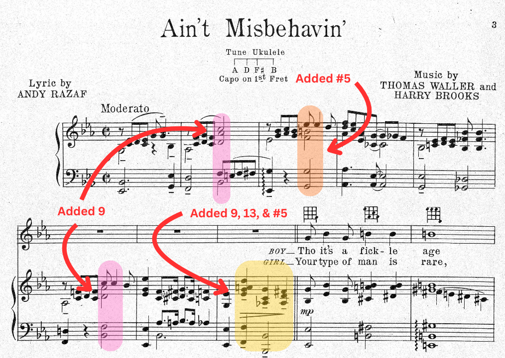 Now we all know that jazz harmony has often been linked with the classical trends of 19th and 20th century contemporary composers such as Ravel, Stravinsky and so on, but the connection to those sounds was also evident in the many thousands of published pieces through Tin Pan Alley. So even though someone like Ellington may have been influenced by the innovations of the classical world, so were the many writers behind the sound of early American popular music. While the original scores of Jerome Kern or Cole Porter may not have used the chord symbol conventions we currently utilize, a quick look at many of their scores showcase voicings which highlight color tones.