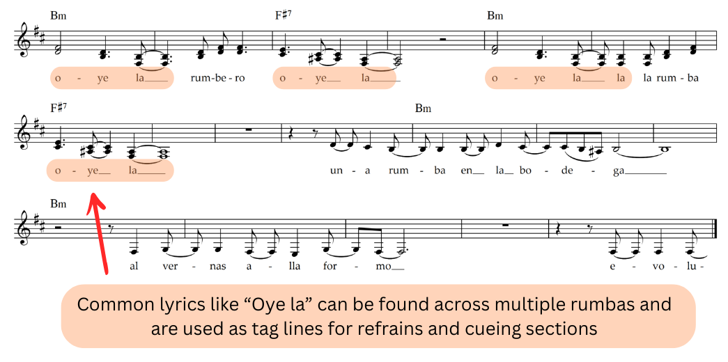 Lyrics play a key role in any rumba performance where they are used to cover a wide variety of topics which often relate to current events. For the most part they are in Spanish, with columbia occasionally making use of African-derived words. Certain phrases and tag lines are used by the lead singer to cue in the choir as well as provide markers to guide their improvisations such as "Que Bueno" and "Oye Lo." Much of the complexity of rumba comes from these improvisations which demonstrate the lyrical skill of the lead singer.