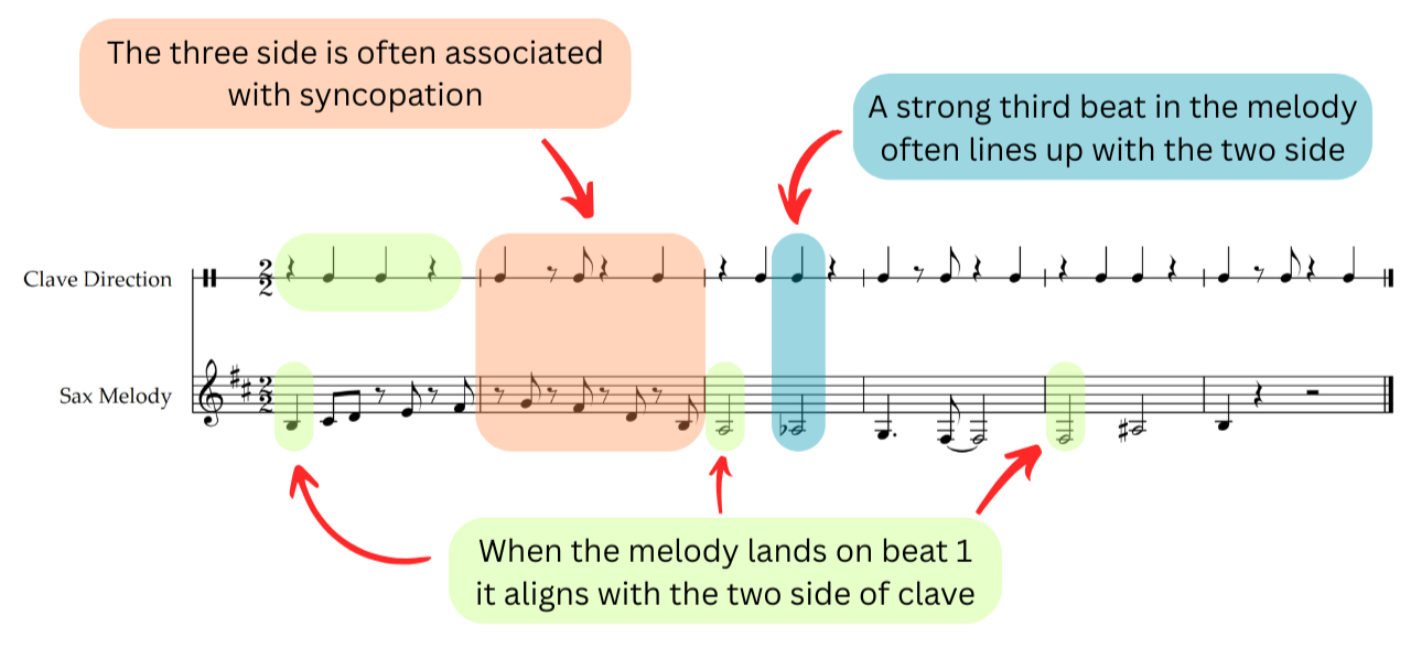 Another staple rule with clave is that one must never flip the direction or play cross-clave, that is, play a rhythm which implies the two side over the three side and vice versa. In the instance where a new section of a piece needs to change orientation, a singular bar can be added or subtracted to the form to allow for the clave to be reorientated naturally. On first impression this might make you think that the piece would feel unnatural, I at least did, but due to the strength of the two-bar cycle, in most cases it is barely even noticeable.