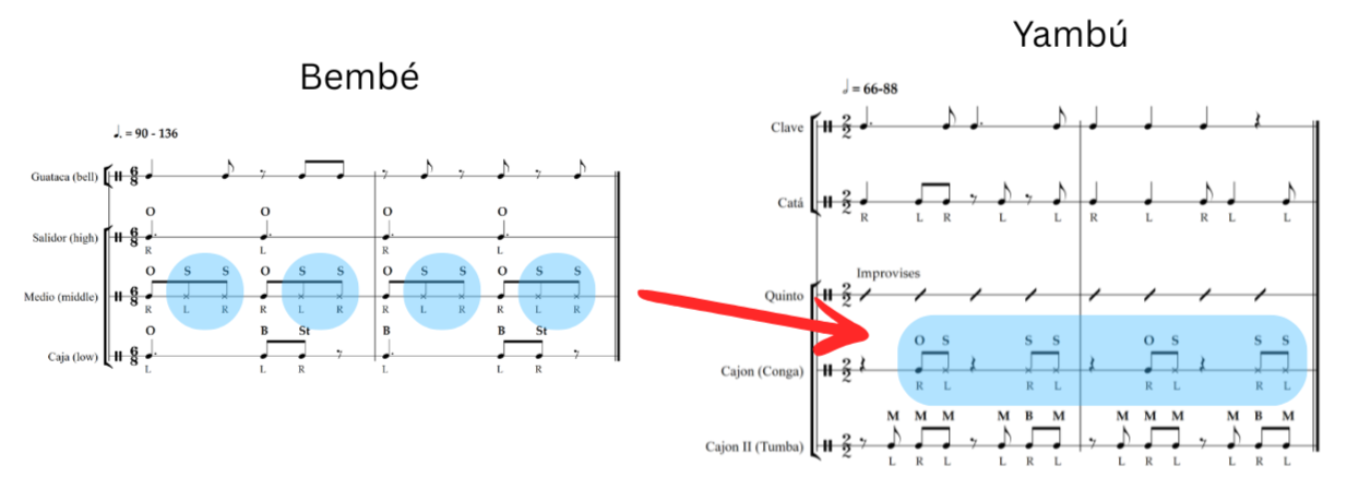 In contrast, this particular example of yambú from Matanzas features a different pair of bell patterns, combining the yambú clave with cáscara. Looking at the cajones, the open tone motif is not present and is instead replaced with two unique parts while the quinto improvises. Unlike the other variation, it is slightly more difficult to trace back all of the rhythms to certain Afro-Cuban styles with this example. The history of cáscara is unfortunately somewhat vague prior to the formation of rumba but based on the rhythm itself, it looks to be a combination of the cinquillo cell with any number of other bell patterns, likely being created as a fusion between certain Afro-Cuban rhythms. On the other hand, the cajon parts are likely derived from a number of different locations, with one example being the Yoruban bembé.