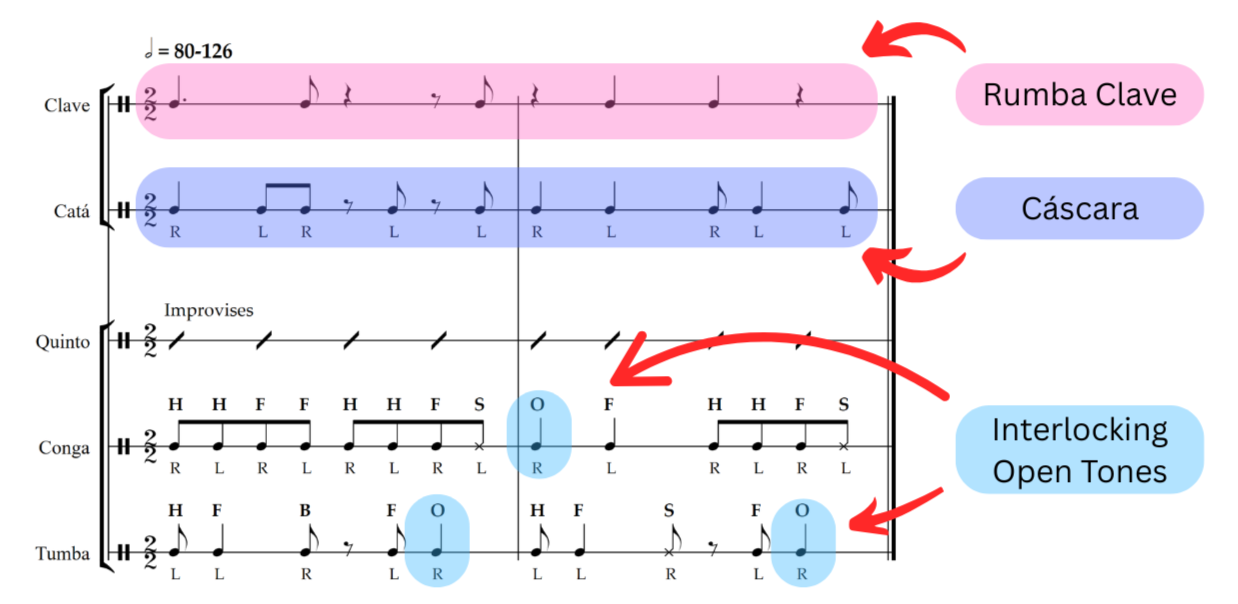 As we mentioned with yambú, two flavors exist for each variant of rumba, one being associated with Matanzas and the other with Havana. In the latter, the primary bell pattern is the rumba clave, with the secondary rhythm either being omitted or playing the yambú clave or cáscara. There are many different options for the supporting drums, but originally the conga and tumba part shared similar rhythms to what we saw in the yambú of Havana. Even though the two parts have developed into many different rhythms over time, they still maintain the open tone phrase which is now considered a major trait of guaguancó. As always, the quinto part improvises.