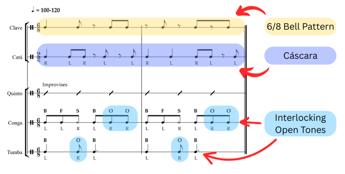 Moving on to the instrumental parts of columbia, the main contrast to the prior styles is that both the Havana and Matanzas variants are primarily in 6/8. In Havana, the 6/8 bell pattern is used alongside a 6/8 variation of the yambú clave. The two supporting drums still play a phrase of open tones but with a slightly altered rhythm. Many of these characteristics can be linked with earlier folkloric Afro-Cuban styles with the bell patterns sharing similarities to Abakuá ceremonies, while components of each of the drum parts can be found across all of the Afro-Cuban cultures.