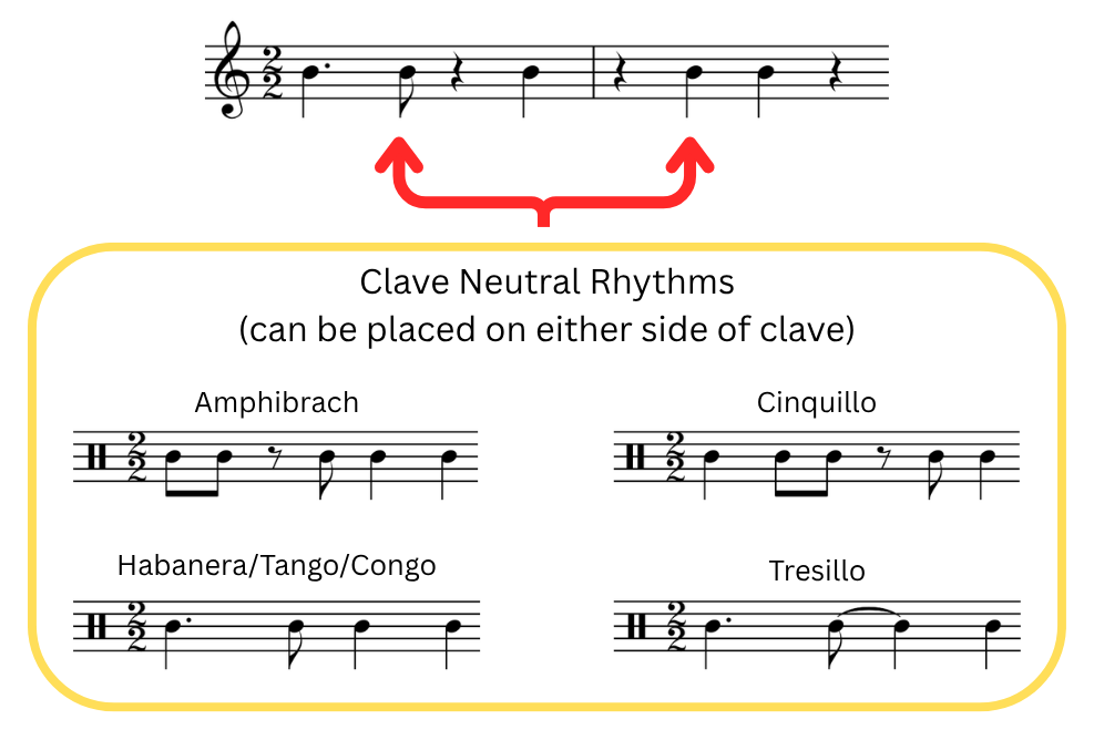 Although we have focused on implying clave direction, there are also rhythms which are considered clave neutral and can be used on either side of the cycle. Just like the two-bar rhythms, over time you’ll pick up a considerable list of neutral rhythms to add to your collection and through our exploration of danzón in the previous resource, we’ve already encountered four such rhythms: the habanera/tango/conga, tresillo, cinquillo, and amphibrach. These particular rhythms were a godsend for me early on as I knew I could put them in whatever orientation and they would work no matter what.