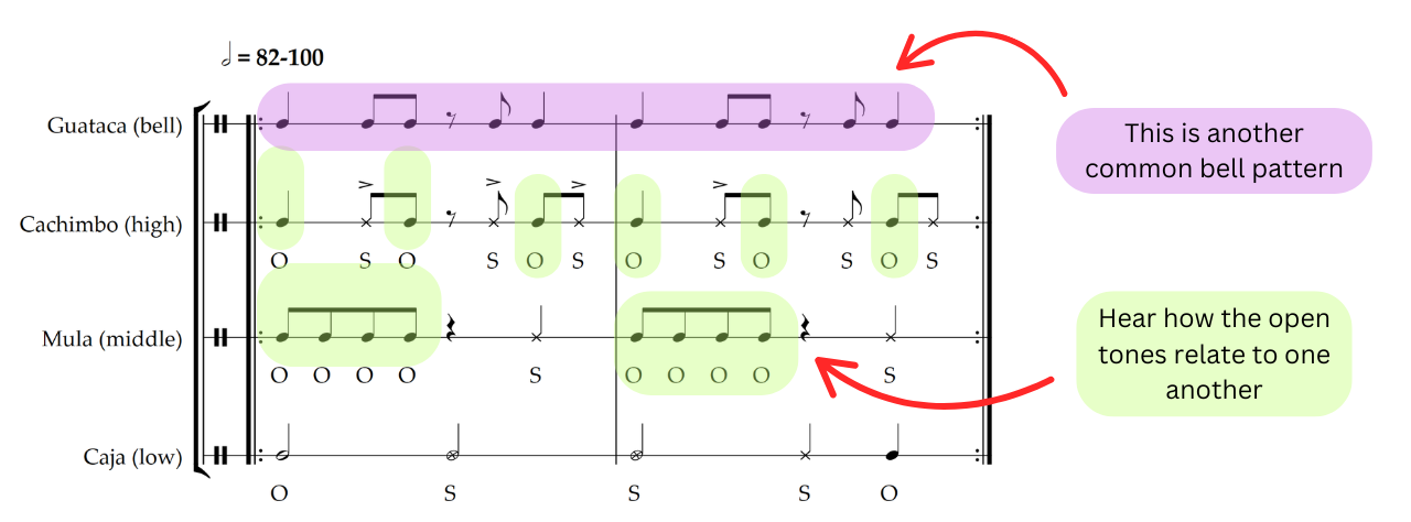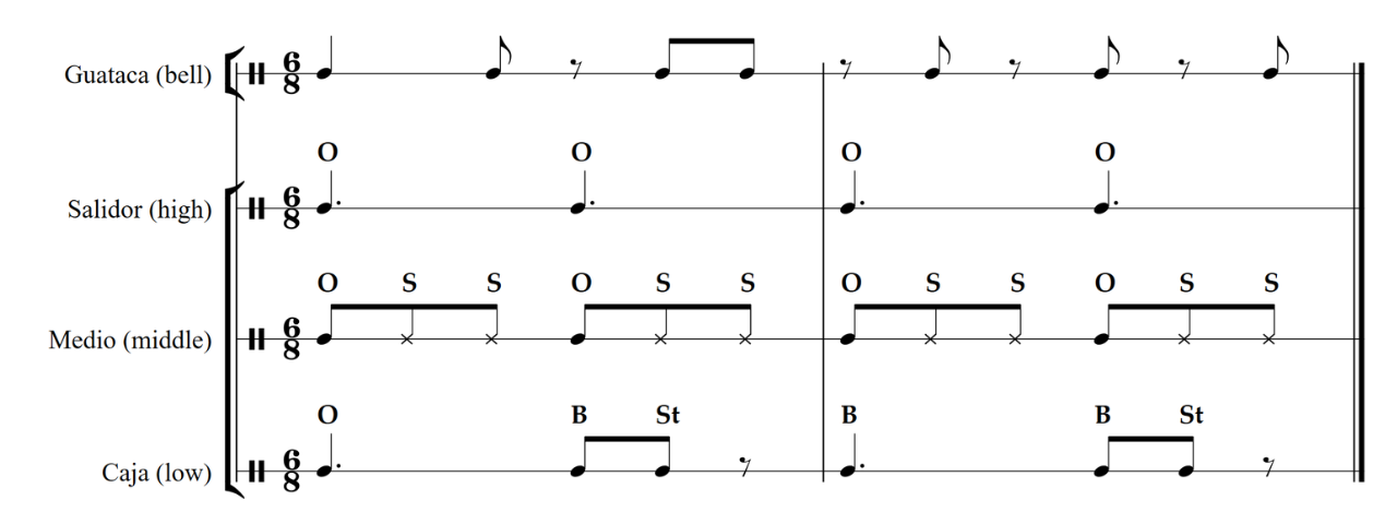 From here, we need to look at the drums and how they operate within the ensemble. Like most folkloric styles, there are three drums each named after the size of the instrument. In this case the highest pitched drum is called the cachimbo and plays a set of repetitive rhythms, alternating slaps and open tones. Working in conjunction with the cachimbo is the mula, the middle sized drum, which plays a similar pattern but with complementary rhythms resulting in an interlocking effect between the two drums. Finally, the lowest drum is called the caja and operates in a unique manner different from the other four parts. The caja’s role is to improvise, and in most cases starts with a common rhythm that they alter as they solo. Hearing the subtle differences in the three drums can be hard and it took many repeat listens for me to be able to identify the individual parts as well as how they work together. My suggestion is to first try and hear each component separately, then look for how they relate to one another by going one instrument at a time. The main points to look for are the interlocking open tones between the two highest drums as well as how everything lines up with the primary bell pattern.