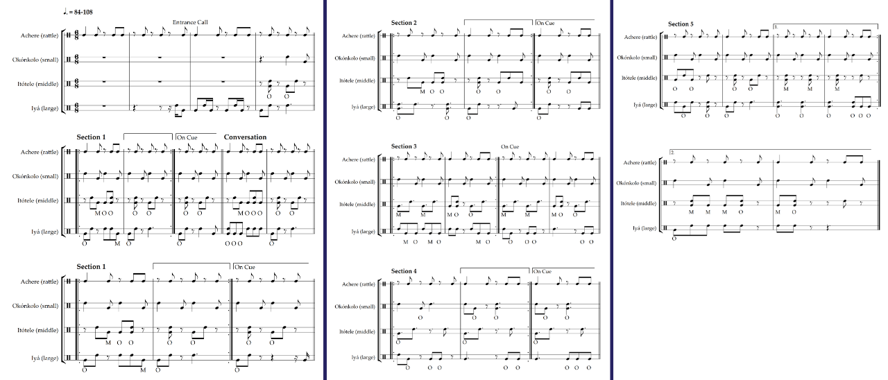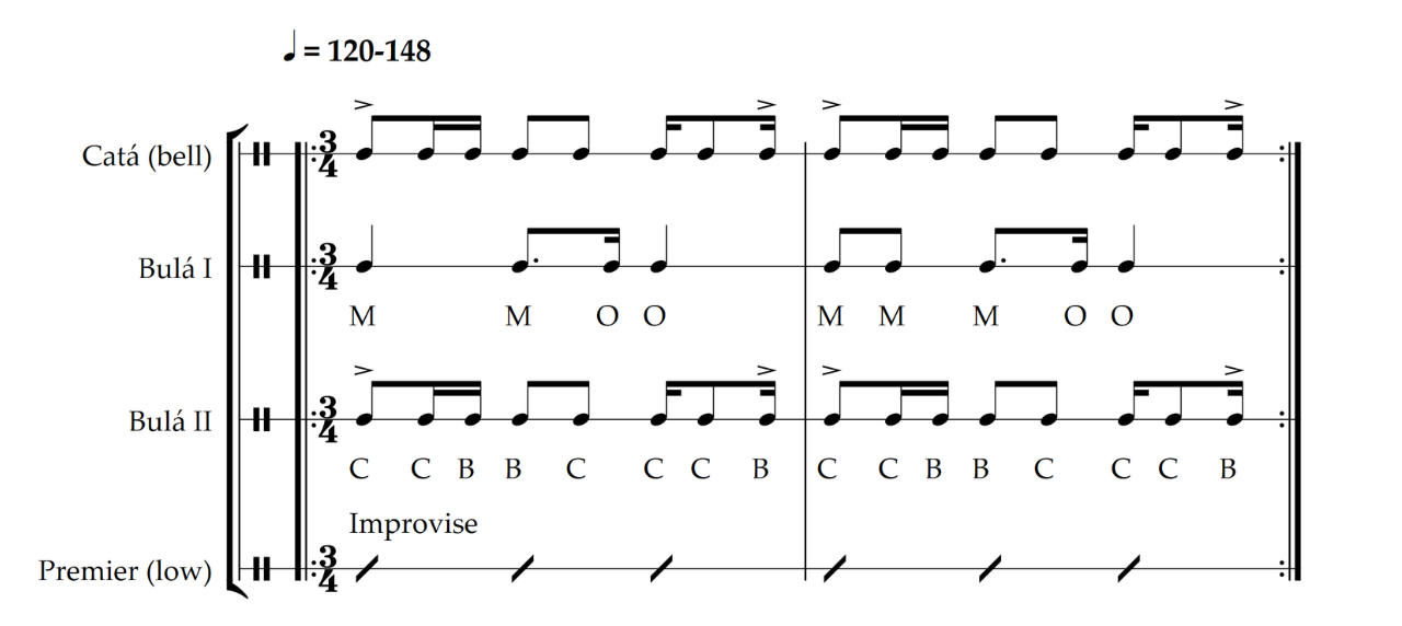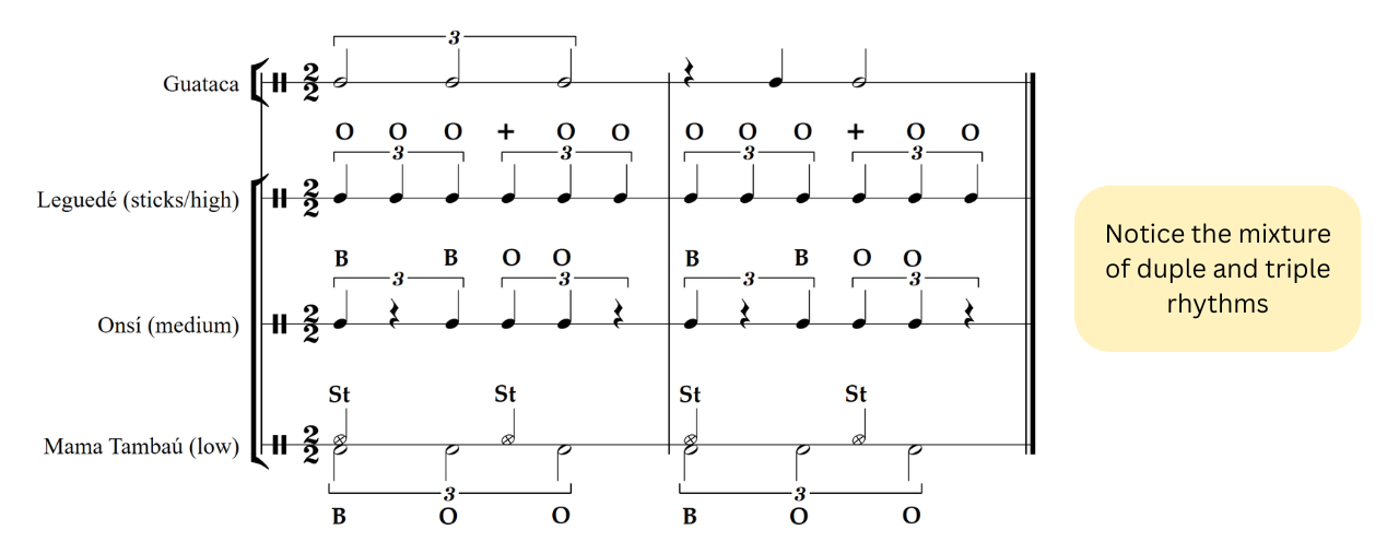 Vodú is an overarching term used to describe a family of religions that share similar principles. There are multiple branches found in Haiti, but in Cuba there are two primary versions called Radá and Petró. As with all religious music in Afro-Cuban culture, Vodú has many different ceremonies, each associated with different deities and holy days, and all accompanied by unique music. The example below is a generalized style associated with Radá and features three drums alongside a bell pattern. The Mama Tambaú (the lowest drum) improvises, while the Leguedé (the highest drum) and the Onsí (middle drum) provide interlocking support parts. The bell pattern is played on the guataca, and features a pattern you may be familiar with, the 3-2 son clave. Although the example is written in duple time, a majority of the parts are felt in 6/8 with only the Mama Tambaú and guataca emphasizing the duple feel. However, this style increases in tempo as it is performed and once it reaches 170bpm the Leguedé starts playing a new pattern which is built off of quavers.