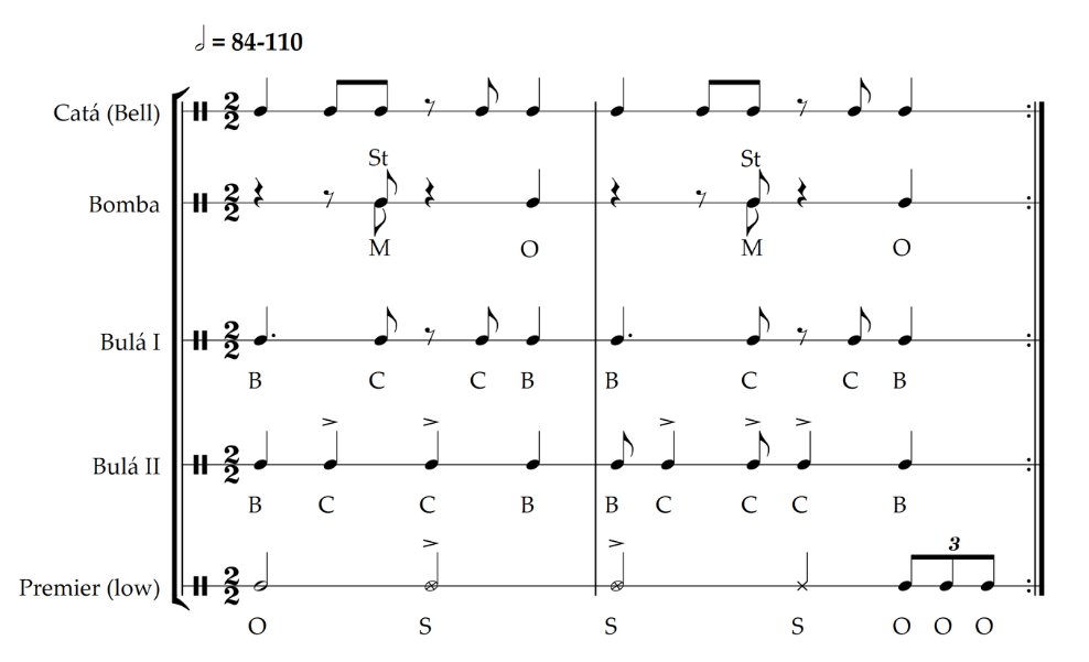 The last Congolese style we are going to cover is called yuka. Typically, the style is played in secular settings and in that way, is comparable to other Afro-Cuban styles such as the Yoruban bembe which doesn’t require the musicians or drums to be blessed. Again it features many of the traits of the last two styles we have covered, but also introduces a few new elements too. Up first are the lyrics which are sung in a language called bozal, a creolized Bantu and Spanish hybrid that was also used by the great Cuban composer Arsenio Rodriguez in the early 20th century. Secondly, the drums are played with a mixture of hands and sticks, creating a texture that is unlike palo and makuta. The sticks are used on the side of the drums, with some drums being fitted with metallic objects to add further texture to the music. Finally, yuka introduces a common Sub-Saharan characteristic that isn’t as obvious in the previous two styles, polyrhythm. While the ensemble is primarily felt in 2/2, the bell pattern played by the catá implies a 6/8 feeling. Some variations of yuka are purely felt in 6/8, but for this section we will be looking at the polyrhythmic variant to help familiarize the feeling of both meters against each other. As we can feel this example in two different time signatures it may be difficult to identify each part when listening to the audio track. Fortunately, the tempo is on our side, making it much easier to hear each part clearly.